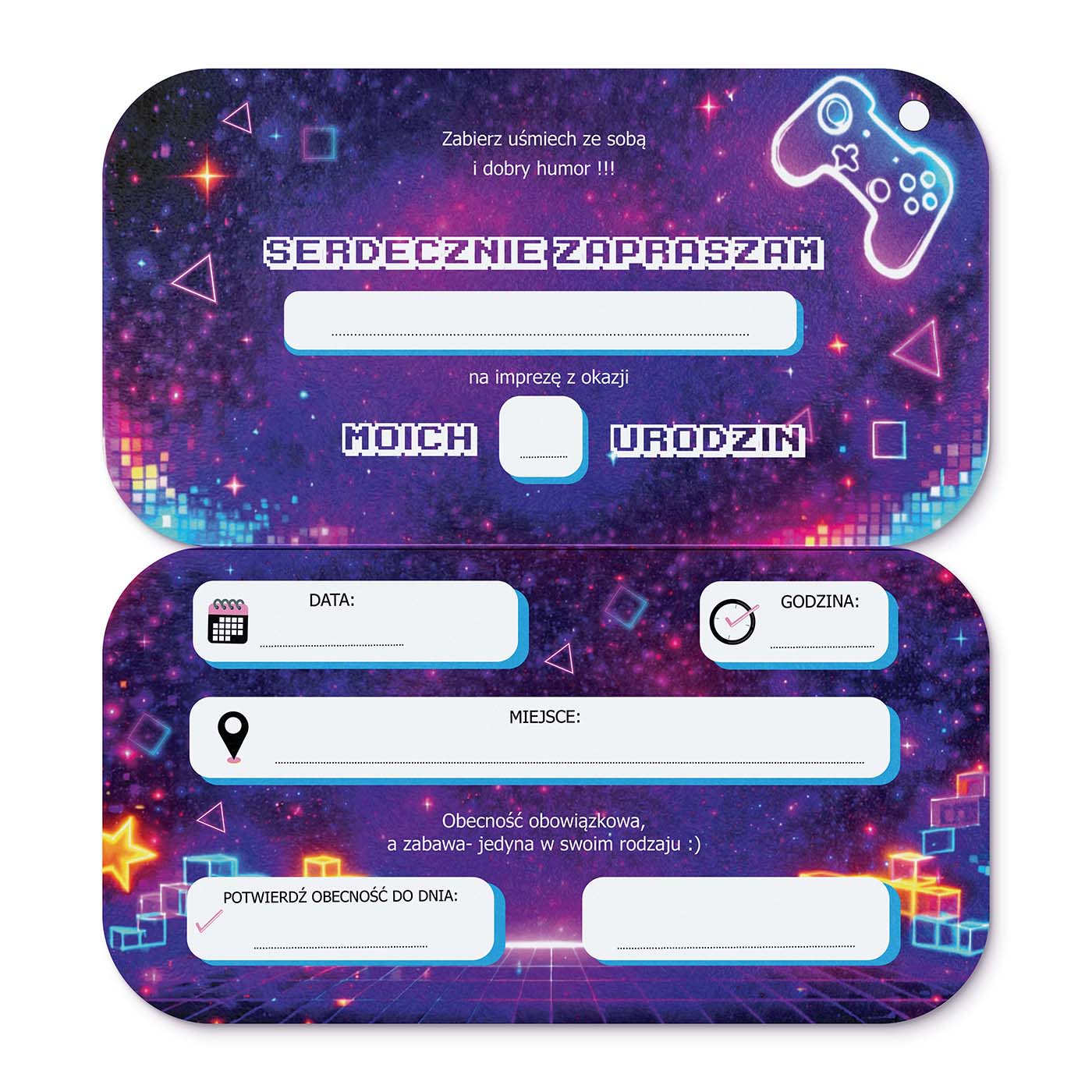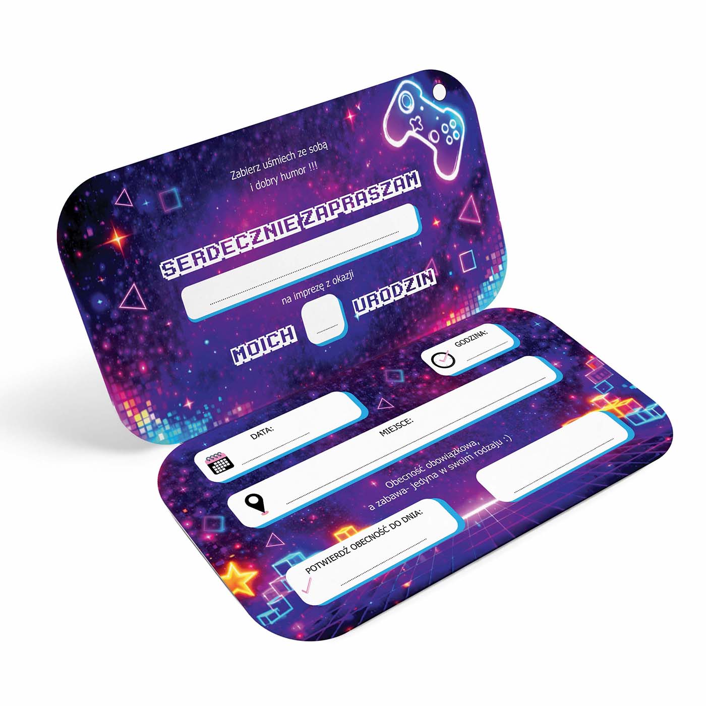 Front zaproszenia stylizowany jest na ekran konsoli z neonowym napisem "Zaproszenie na urodziny", a całość utrzymana w energetycznych kolorach - z jednej strony zielony panel, z drugiej fioletowy, dokładnie jak w prawdziwym sprzęcie gamingowym. Po otwarciu zaproszenia mamy czytelny układ do uzupełnienia danych.