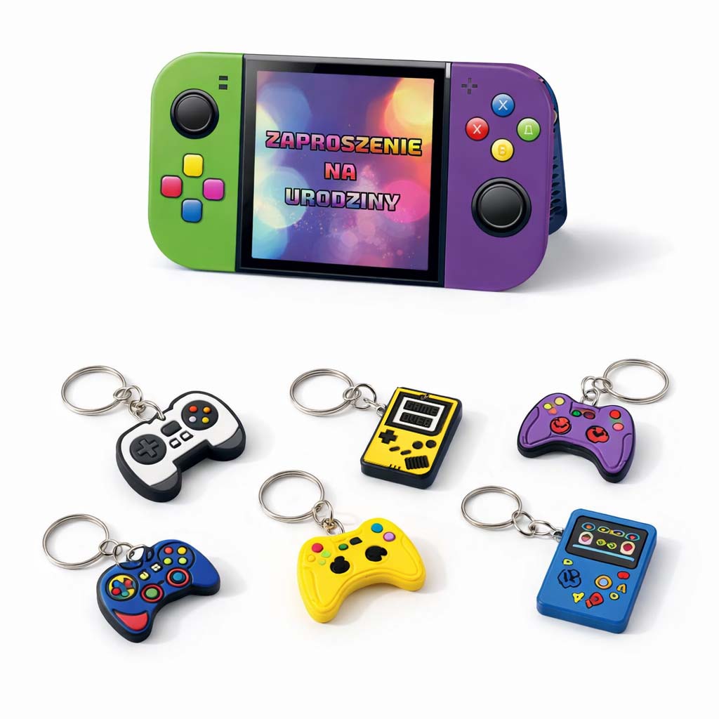 Ale najlepsze? Do każdego zaproszenia dorzucany jest losowy brelok gamingowy - mały gadżet, który robi ogromną różnicę. Każde zapraszane dziecko dostaje coś ekstra, co zostaje z nim na dłużej niż sama impreza.